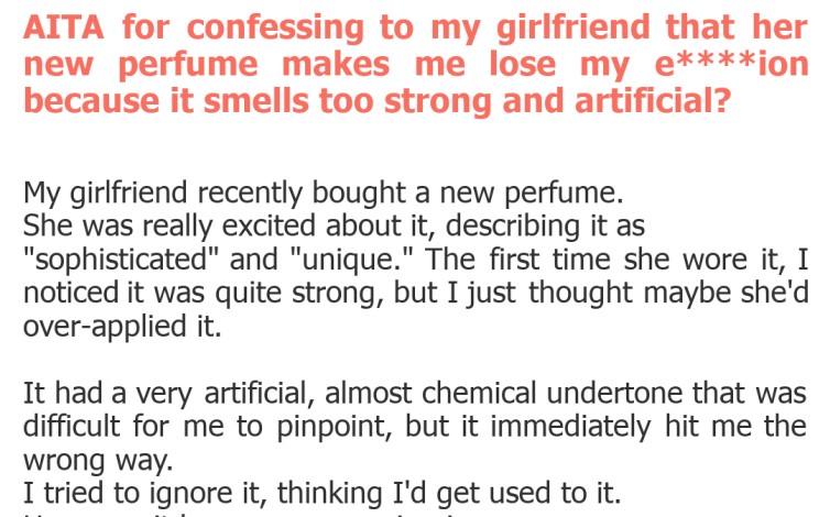 "AITA for confessing to my girlfriend that her new perfume makes me lose my e****ion because it smells too strong and artificial?"