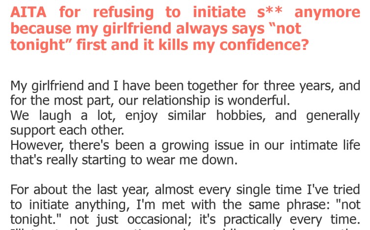 "AITA for refusing to initiate s** anymore because my girlfriend always says “not tonight” first and it kills my confidence?"