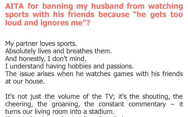 "AITA for banning my husband from watching sports with his friends because “he gets too loud and ignores me”?"