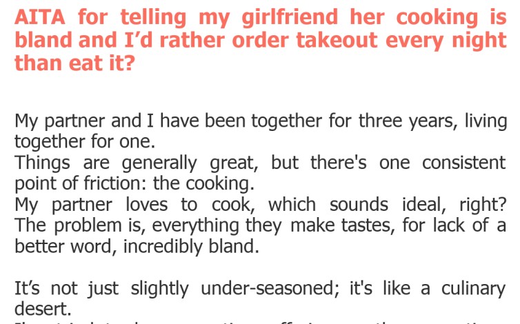 "AITA for telling my girlfriend her cooking is bland and I’d rather order takeout every night than eat it?"