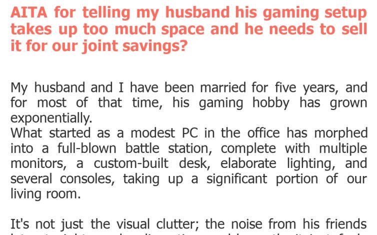 "AITA for telling my husband his gaming setup takes up too much space and he needs to sell it for our joint savings?"
