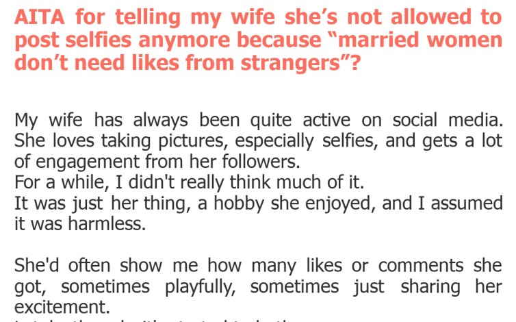 "AITA for telling my wife she’s not allowed to post selfies anymore because “married women don’t need likes from strangers”?"