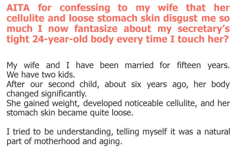 "AITA for confessing to my wife that her cellulite and loose stomach skin disgust me so much I now fantasize about my secretary’s tight 24-year-old body every time I touch her?"