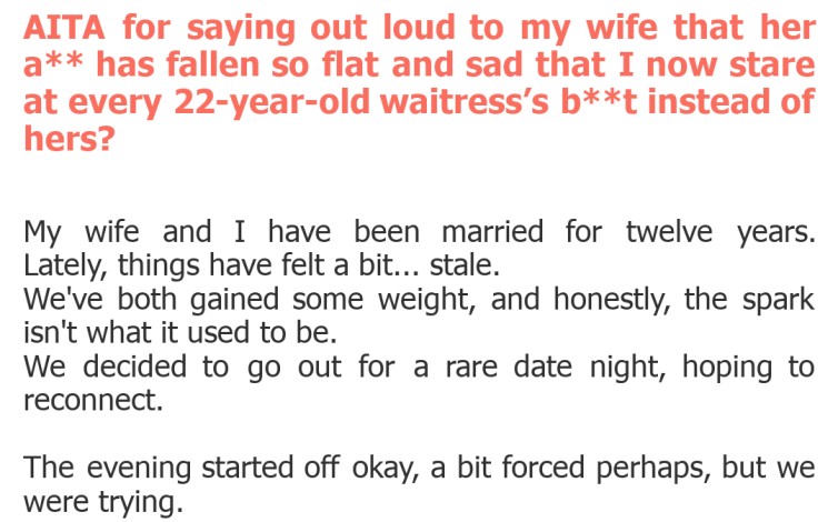 "AITA for saying out loud to my wife that her a** has fallen so flat and sad that I now stare at every 22-year-old waitress’s b**t instead of hers?"