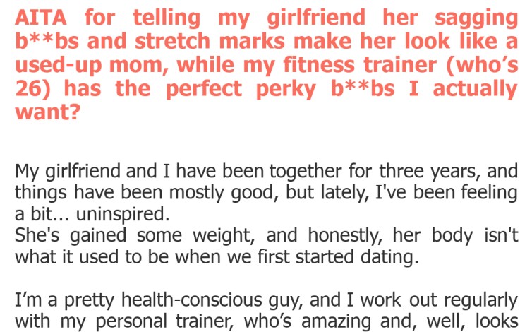 "AITA for telling my girlfriend her sagging b**bs and stretch marks make her look like a used-up mom, while my fitness trainer (who’s 26) has the perfect perky b**bs I actually want?"