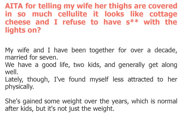 "AITA for telling my wife her thighs are covered in so much cellulite it looks like cottage cheese and I refuse to have s** with the lights on?"
