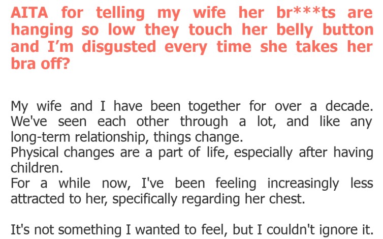 "AITA for telling my wife her br***ts are hanging so low they touch her belly button and I’m disgusted every time she takes her bra off?"