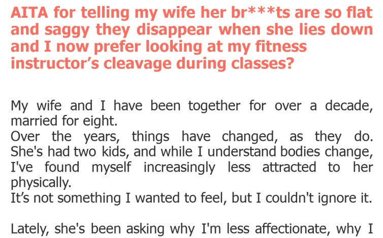 "AITA for telling my wife her br***ts are so flat and saggy they disappear when she lies down and I now prefer looking at my fitness instructor’s cleavage during classes?"