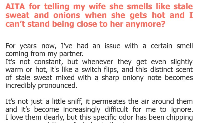 "AITA for telling my wife she smells like stale sweat and onions when she gets hot and I can’t stand being close to her anymore?"