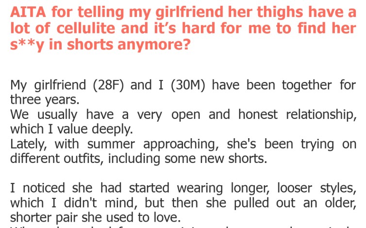 "AITA for telling my girlfriend her thighs have a lot of cellulite and it’s hard for me to find her s**y in shorts anymore?"