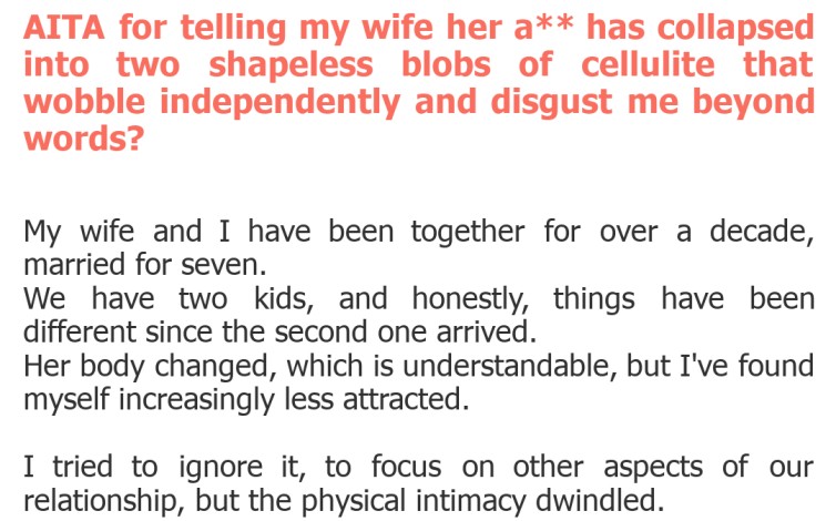 "AITA for telling my wife her a** has collapsed into two shapeless blobs of cellulite that wobble independently and disgust me beyond words?"