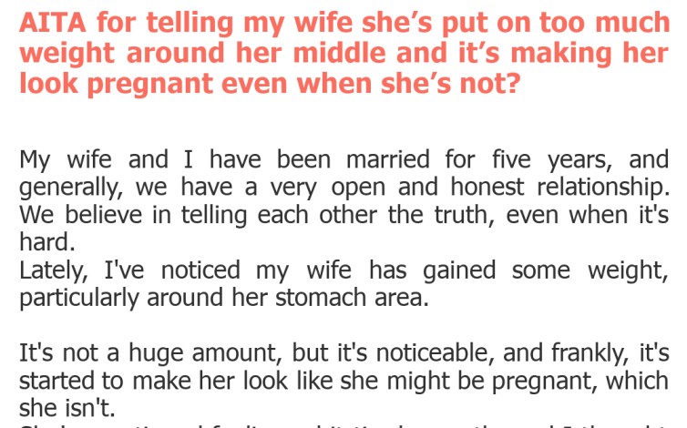 "AITA for telling my wife she’s put on too much weight around her middle and it’s making her look pregnant even when she’s not?"