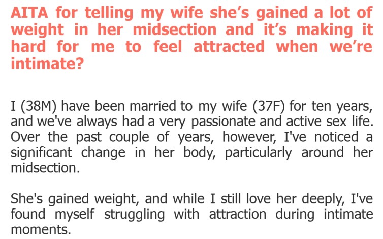 "AITA for telling my wife she’s gained a lot of weight in her midsection and it’s making it hard for me to feel attracted when we’re intimate?"