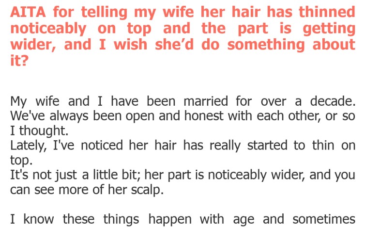 "AITA for telling my wife her hair has thinned noticeably on top and the part is getting wider, and I wish she’d do something about it?"
