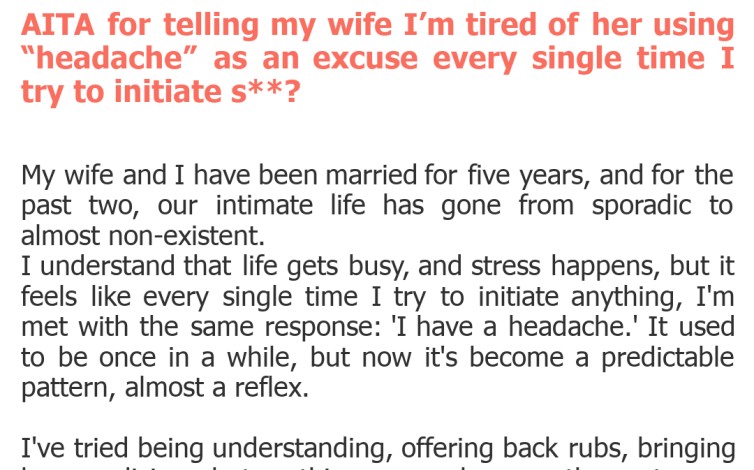 "AITA for telling my wife I’m tired of her using “headache” as an excuse every single time I try to initiate s**?"
