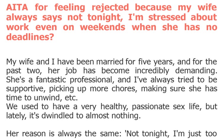 "AITA for feeling rejected because my wife always says not tonight, I'm stressed about work even on weekends when she has no deadlines?"