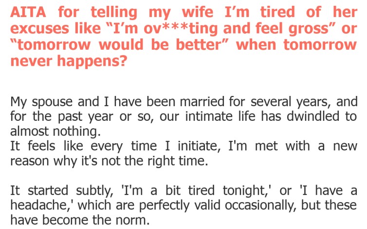 AITA for telling my wife I’m tired of her excuses like “I’m ov***ting and feel gross” or “tomorrow would be better” when tomorrow never happens?