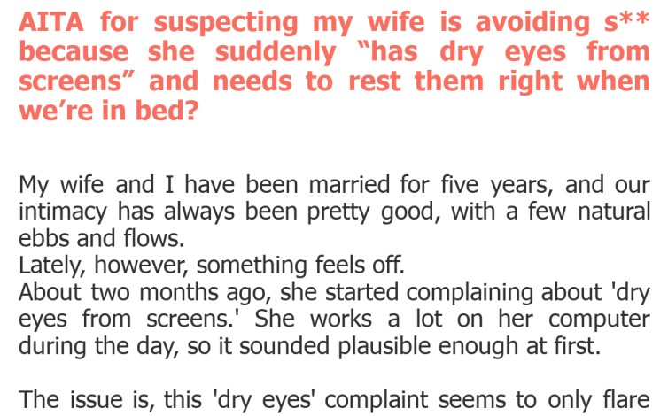 "AITA for suspecting my wife is avoiding s** because she suddenly “has dry eyes from screens” and needs to rest them right when we’re in bed?"