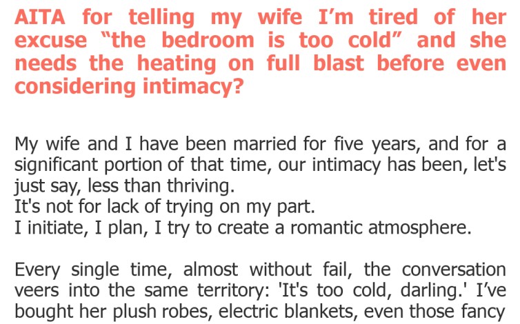 "AITA for telling my wife I’m tired of her excuse “the bedroom is too cold” and she needs the heating on full blast before even considering intimacy?"