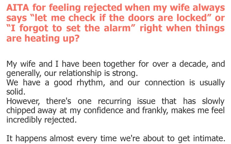 "AITA for feeling rejected when my wife always says “let me check if the doors are locked” or “I forgot to set the alarm” right when things are heating up?"