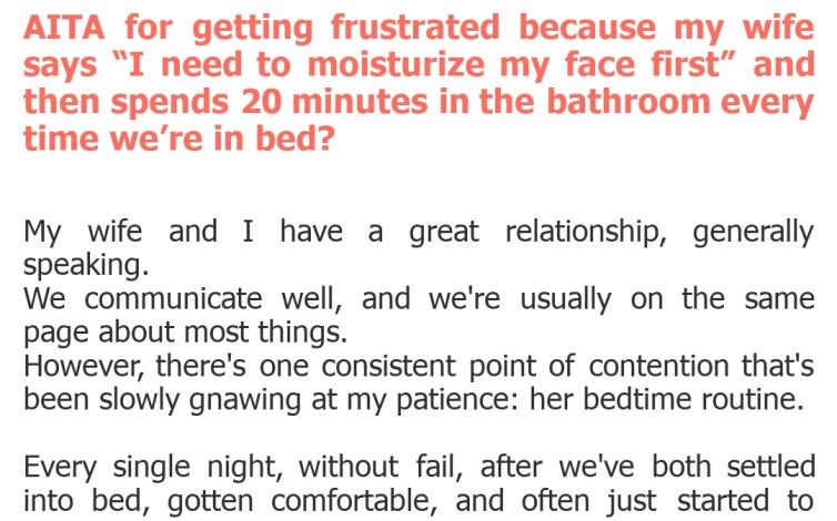 "AITA for getting frustrated because my wife says “I need to moisturize my face first” and then spends 20 minutes in the bathroom every time we’re in bed?"