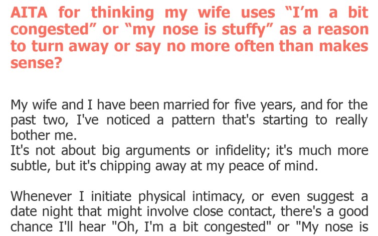"AITA for thinking my wife uses “I’m a bit congested” or “my nose is stuffy” as a reason to turn away or say no more often than makes sense?"