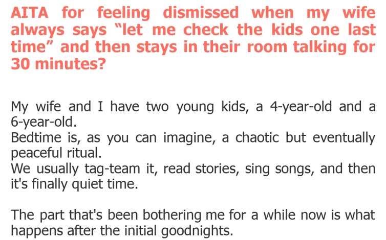 "AITA for feeling dismissed when my wife always says “let me check the kids one last time” and then stays in their room talking for 30 minutes?"