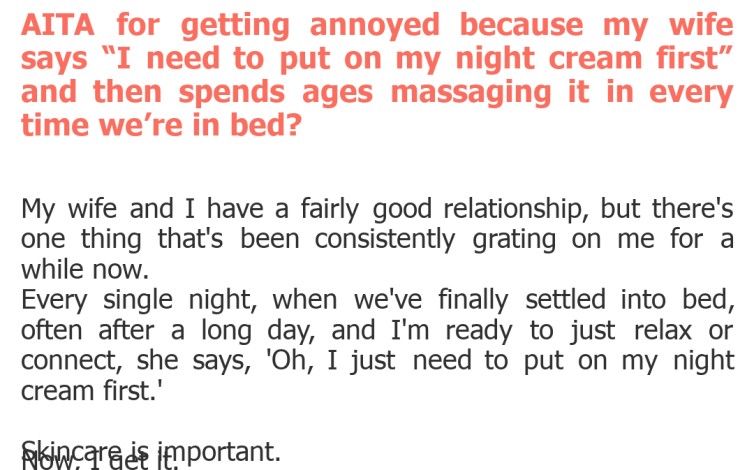 "AITA for getting annoyed because my wife says “I need to put on my night cream first” and then spends ages massaging it in every time we’re in bed?"