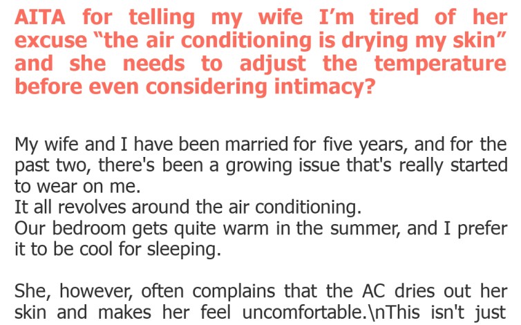 Ah, the delicate dance of marital bliss, or sometimes, marital chill. We've all been there: a seemingly minor disagreement that somehow morphs into a significant roadblock in the intimacy department. Today, we're diving into a story that perfectly encapsulates how everyday comforts, or lack thereof, can cast a surprising shadow over the more tender moments couples share. It's a tale of temperature, skin care, and the unspoken frustrations that simmer beneath the surface of a relationship.\nOur original poster, let's call him OP, brings a dilemma that many might secretly relate to but rarely discuss publicly. His partner's consistent excuse about the air conditioning affecting her skin has created a rift, impacting their physical connection. Is his frustration justified, or is he missing a crucial piece of the puzzle? Let's unpack the layers of this heated (or rather, cooled) debate and see if the internet thinks he's a jerk for drawing a line in the sand.