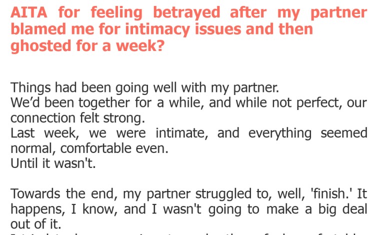 AITA for feeling betrayed after my partner blamed me for intimacy issues and then ghosted for a week?