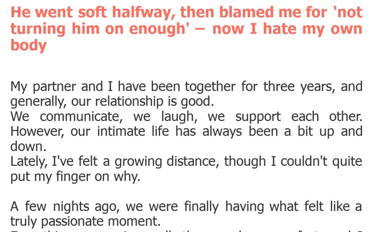 He went soft halfway, then blamed me for ‘not turning him on enough’ – now I hate my own body
