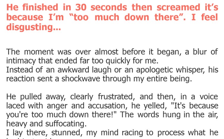 "He finished in 30 seconds then screamed it’s because I’m “too much down there”. I feel disgusting…"